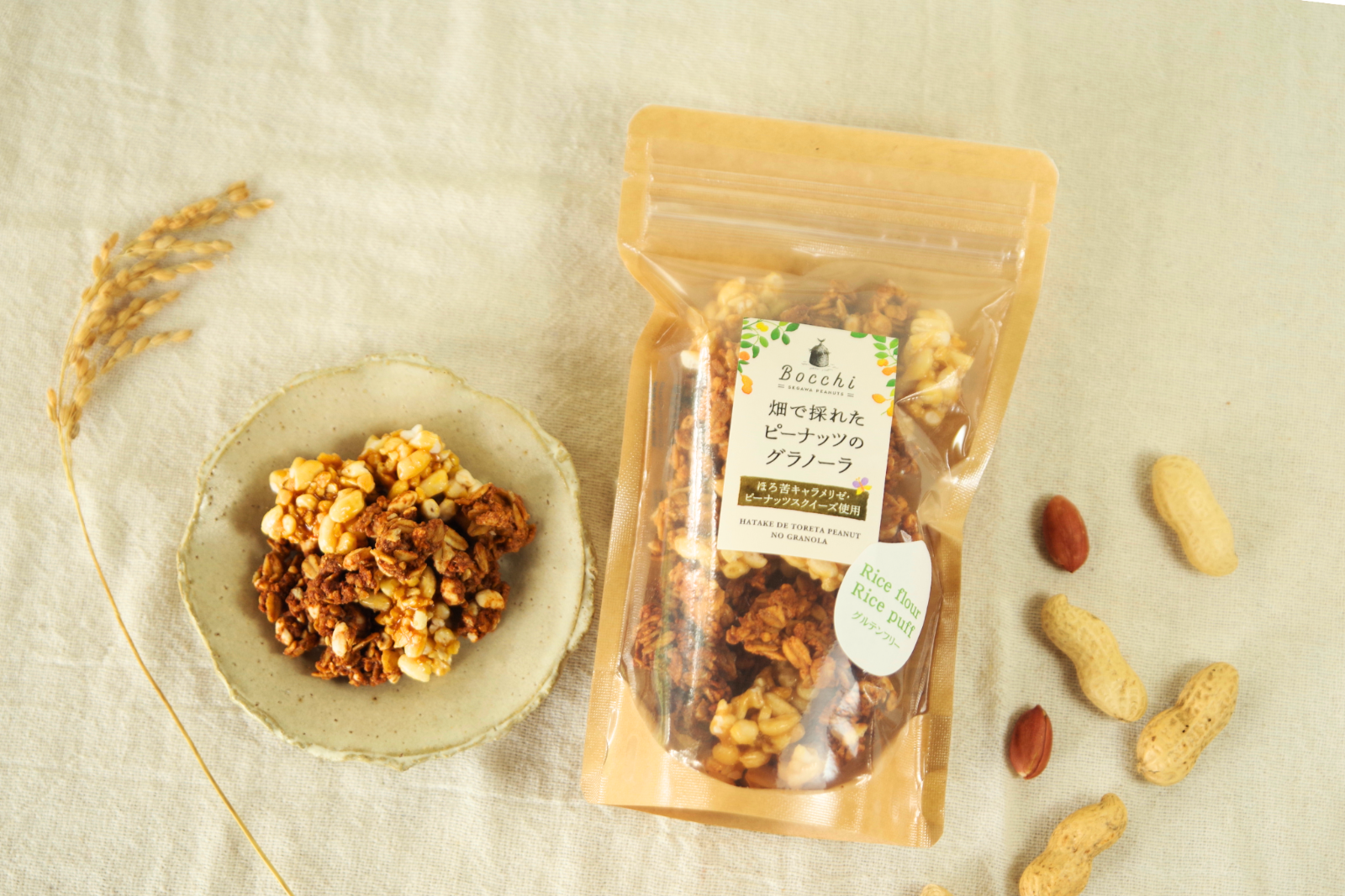 ピーナッツを余すことなく使い切る、"フードロス"をめざし、試行錯誤を経て生まれたグラノーラ。たっぷりのキャラメルとピーナッツの香ばしさが相性抜群、そして安心な完全グルテンフリー、ライスパフのサクッと感も楽しめる…とっておきのBocchiのグラノーラへ。